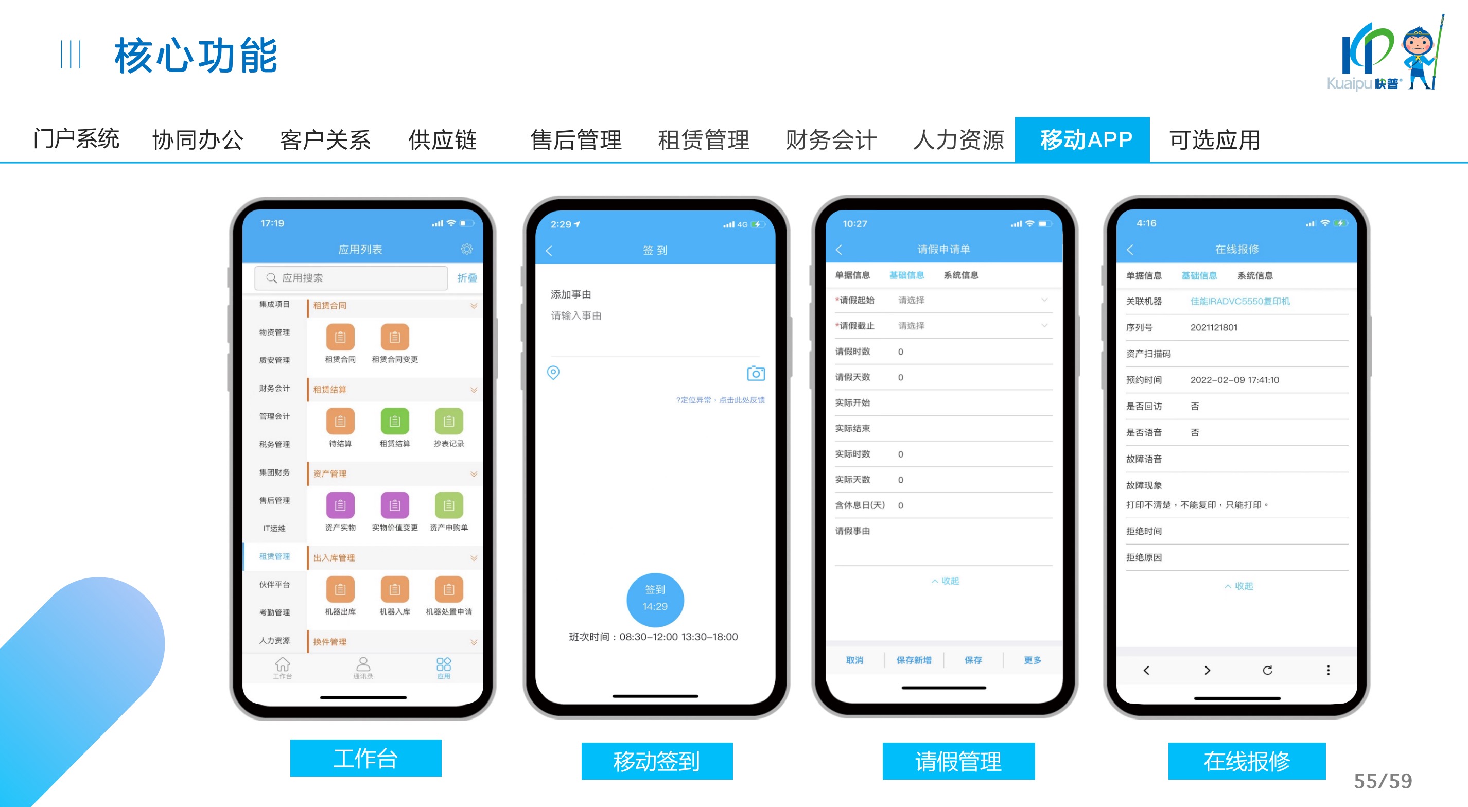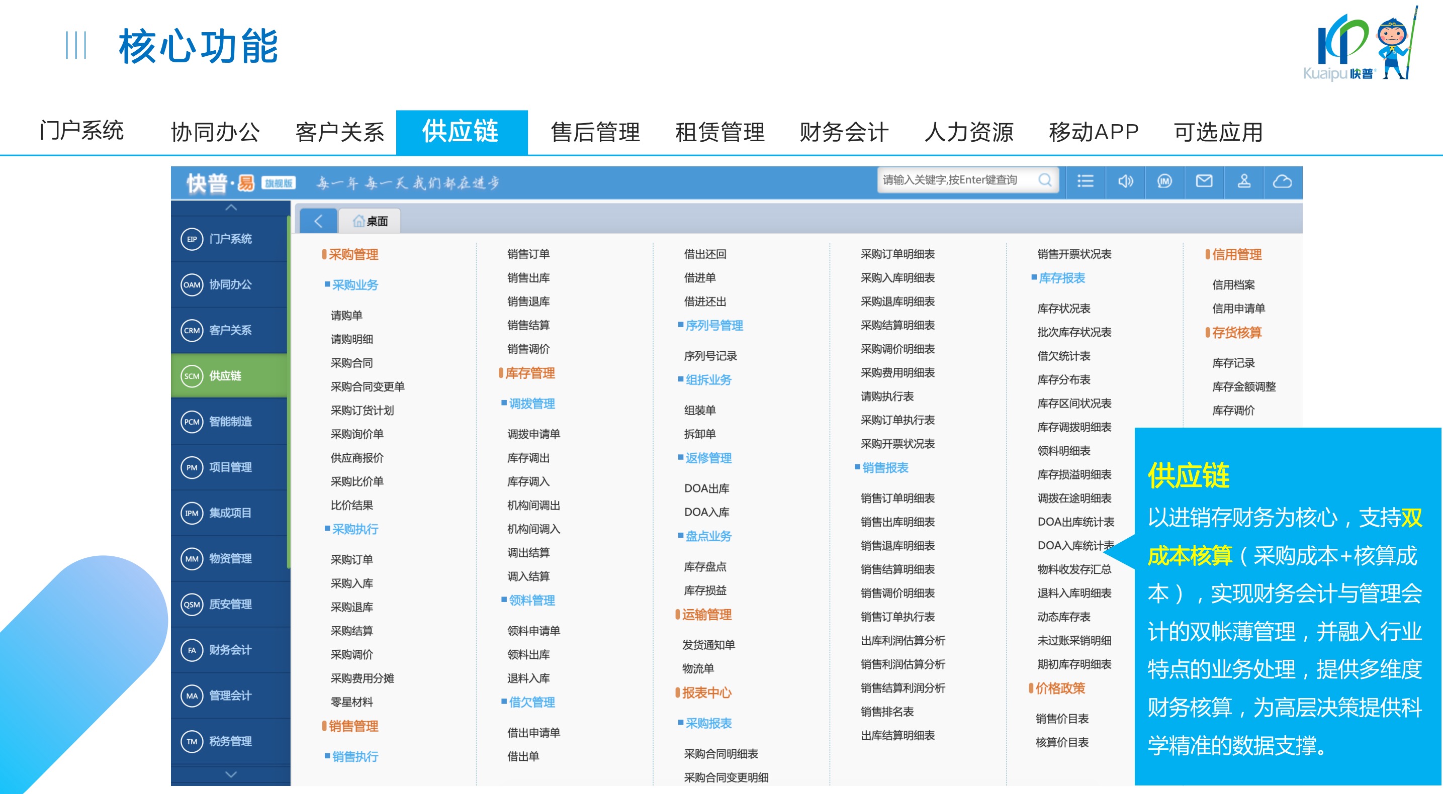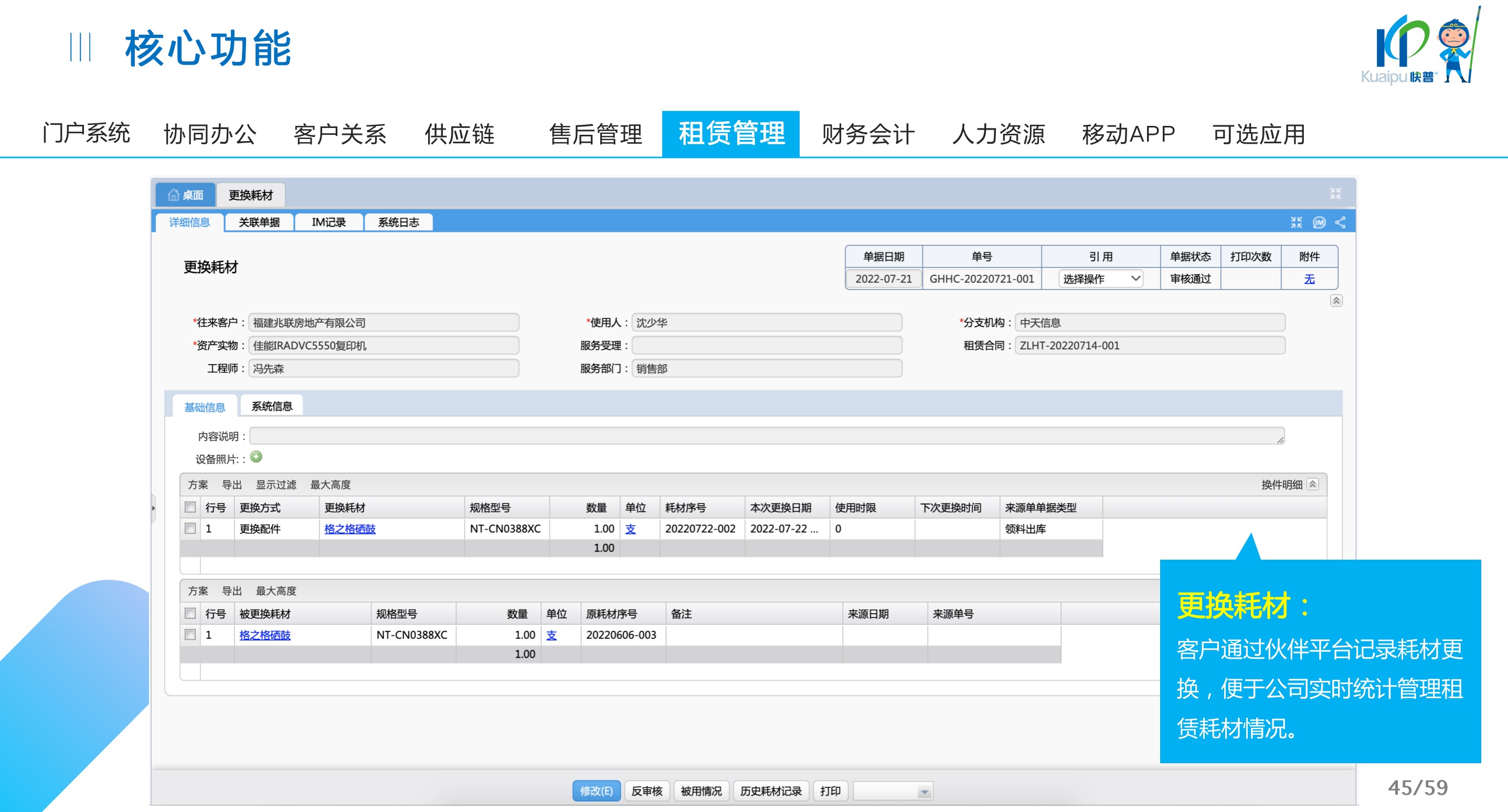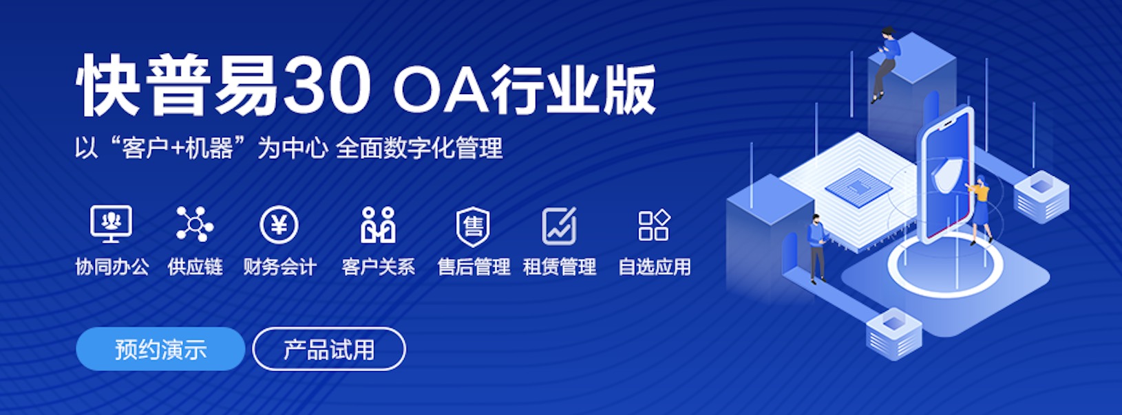 快普易30基于快普近20年在全國上萬家OA企業(yè)的實施與服務(wù)經(jīng)驗,融合了行業(yè)成功的管理智慧,以“客戶+機器”為中心提供數(shù)字化轉(zhuǎn)型解決方案,全面解決銷售、服務(wù)、租賃等多種業(yè)務(wù)模式的管理需求,以及企業(yè)經(jīng)營核算分析。
