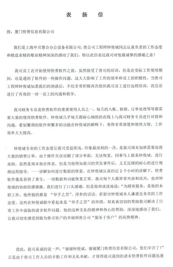 信中提到,申貝慧合財(cái)務(wù)人員是快普軟件的重要使用人員之一,每天入賬、核銷(xiāo)、訂單處理等等都需要大量的使用快普軟件。鐘俊斌工程師耐心細(xì)致的與其財(cái)務(wù)人員在線上對(duì)接溝通,幫助其快速順暢使用軟件,提高工作效率。
