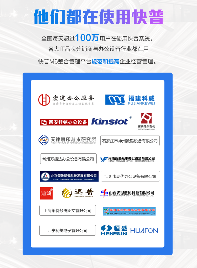快普M6整合管理平臺整合了“協(xié)同辦公、客戶關(guān)系管理、供應(yīng)鏈管理、財務(wù)管理、運(yùn)維服務(wù)管理、租賃抄表管理、生產(chǎn)管理、研發(fā)管理、人力資源管理、電子商務(wù)管理”等業(yè)務(wù)系統(tǒng),同時實(shí)現(xiàn)與移動互聯(lián)應(yīng)用、電話呼叫中心、郵件系統(tǒng)、手機(jī)短信、考勤機(jī)、手持終端等各種硬件設(shè)備無縫銜接。