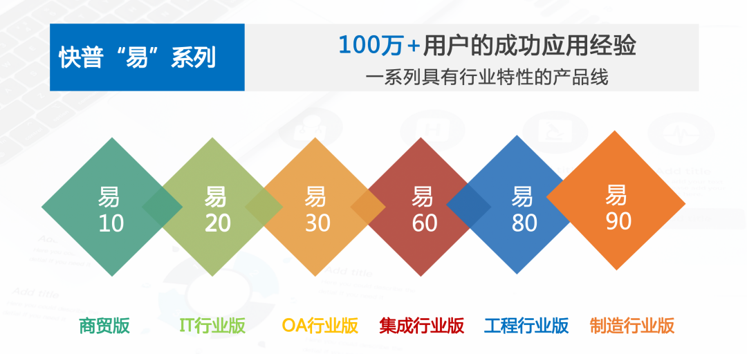 除易10之外,快普“易”系列同時推出了多個行業(yè)版本(如下圖),用“標準化+行業(yè)化+個性化”等特性解決企業(yè)大量個性化需求,從而幫助客戶高效率、低成本地實現(xiàn)數(shù)字化轉(zhuǎn)型升級。